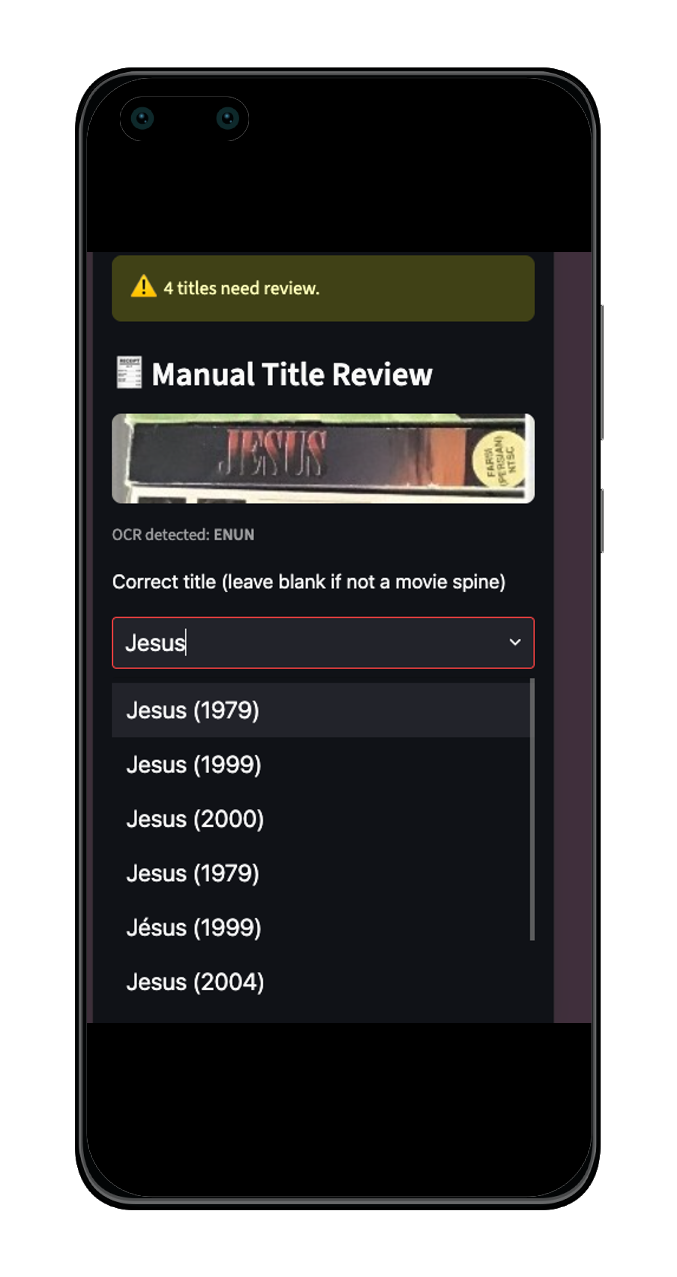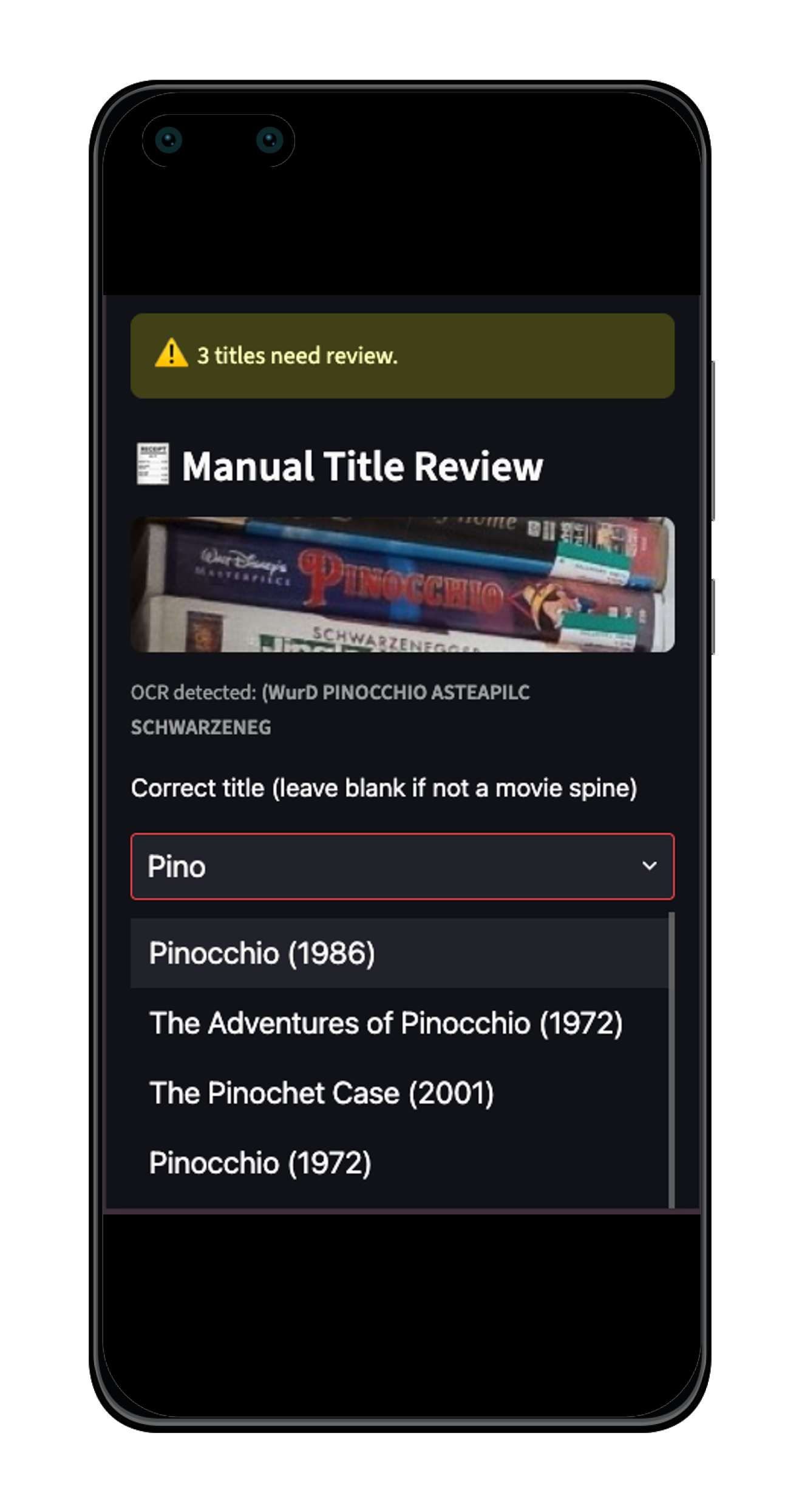 If Tapewrm gets stumped on a tape, the app will present you with the extracted spine and ask you to fill out the title manually with the help of live autocomplete results by TMDB (The Movie Database).